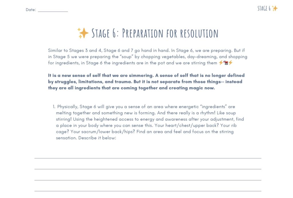 By going through each of the 12 Stages week by week using a journaling prompt directly after your time on the adjusting table, we are going to gain so many distinctions by bringing experiences into words and then using words to help create even more Energy Rich experiences ✨